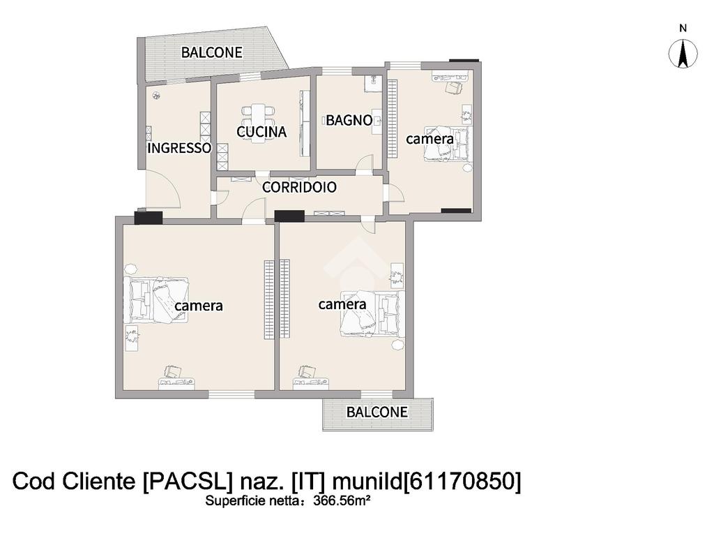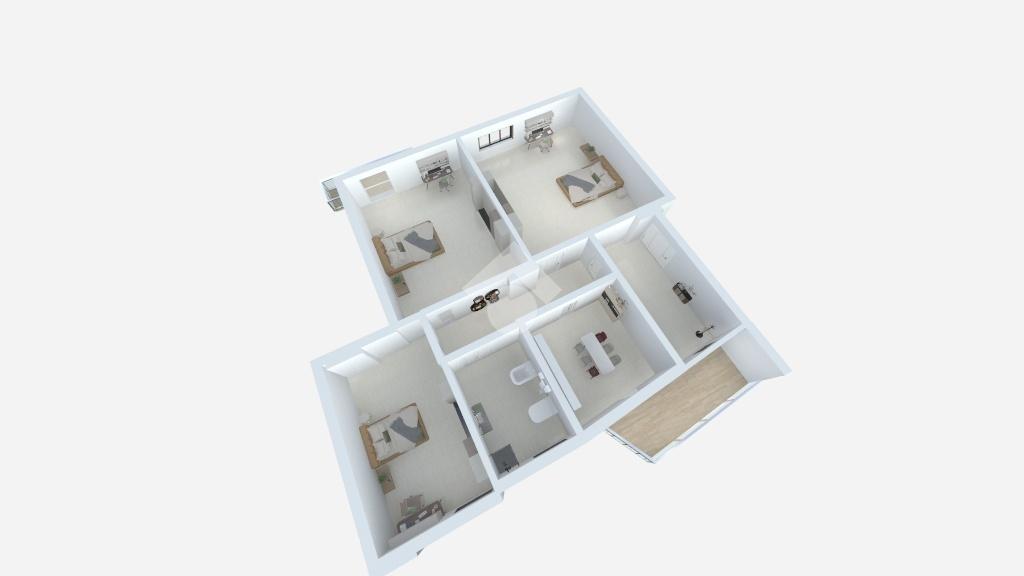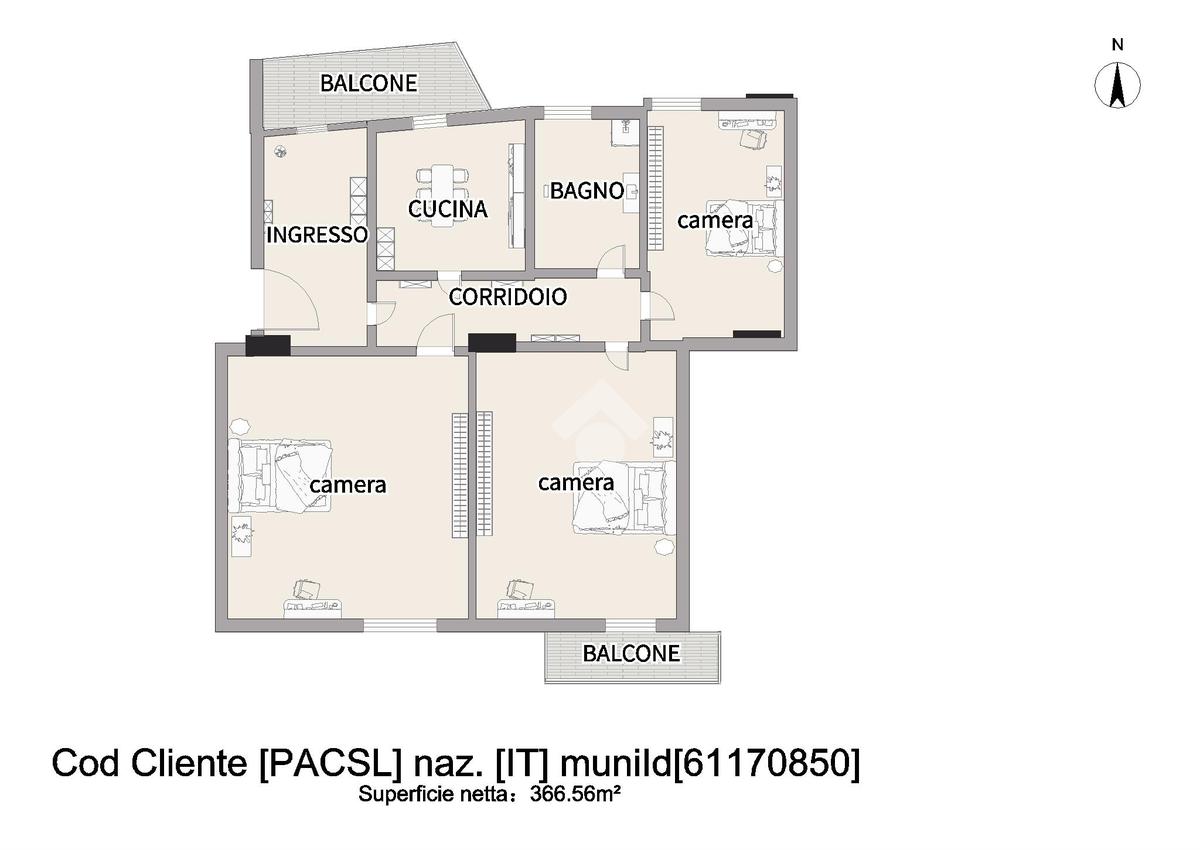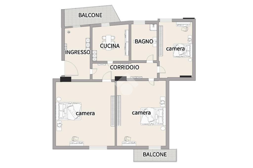 L'immobile si estende su una superficie di 73 mq e la disposizione interna comprende due camere da letto di cui una con balcone e l'altra con finestra, una cameretta, cucina semi-abitabile con balcone e wc bagno con vasca.